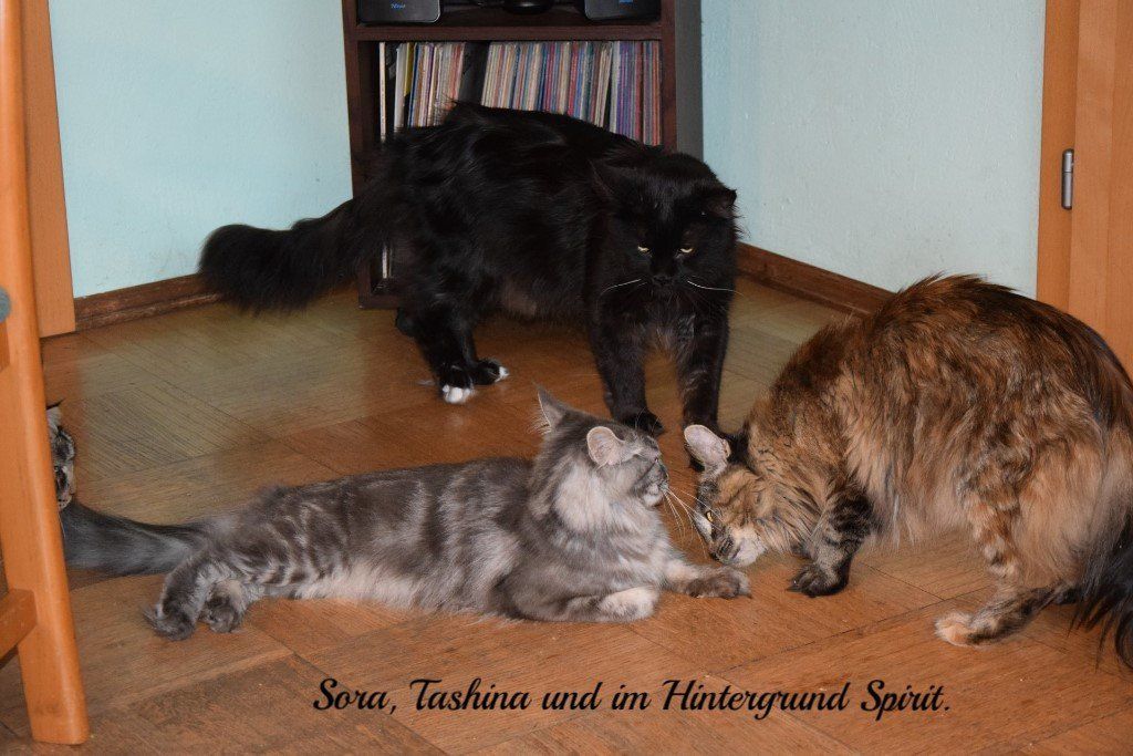 Sora und Tashina vertrugen sich von Anfang an sehr gut mit Waoka und Spirit. Ich erinnere mich, dass das Angewöhnen an die Kater Minuten gedauert hat.